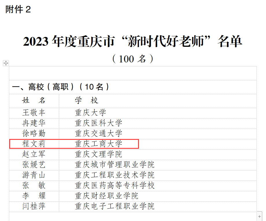 为深入贯彻落实党的二十大精神,贯彻落实习近平总书记关于青少年成长成才、加强家风家教和师德师风建设等方面的重要讲话精神,贯彻落实市委六届二次全会精神,2023年3月至6月,市委宣传部、市文明办、市教委、团市委、市妇联、市关工委联合开展了重庆市 2023 年度“新时代好少年、好老师、好家长”学习宣传活动。经区县(各高校)推荐、专家综合评审、活动组委会审定等环节,选树出“新时代好老师”100名(其中高校教师10名),bat365官网会计学院教师程文莉获评“新时代好老师”。