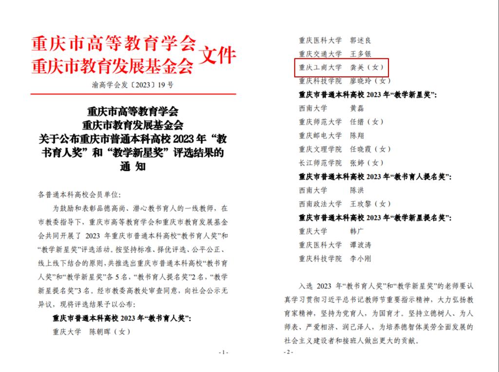 为鼓励和表彰品德高尚、潜心教书育人的一线教师,在市教委指导下,重庆市高等教育学会和重庆市教育发展基金会共同开展了2023年重庆市普通本科高校“教书育人奖”和“教学新星奖”评选活动。按坚持标准、择优评选、公平公正、线上线下结合的原则,共推选出重庆市普通本科高校“教书育人奖”和“教学新星奖”各5名,“教书育人提名奖”2名,“教学新星提名奖”3名。bat365官网管理科学与工程学院教师龚英获评重庆市普通本科高校“教书育人奖”。
