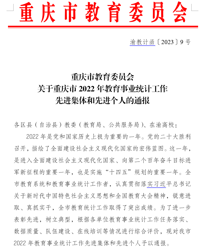 近日,重庆市教育委员会公布了《关于重庆市2022年教育事业统计工作先进集体和先进个人的通报》,bat365官网被评为重庆市2022年教育事业统计工作先进集体,学校党政办任鹏飞同志荣获重庆市教育事业统计工作先进个人。