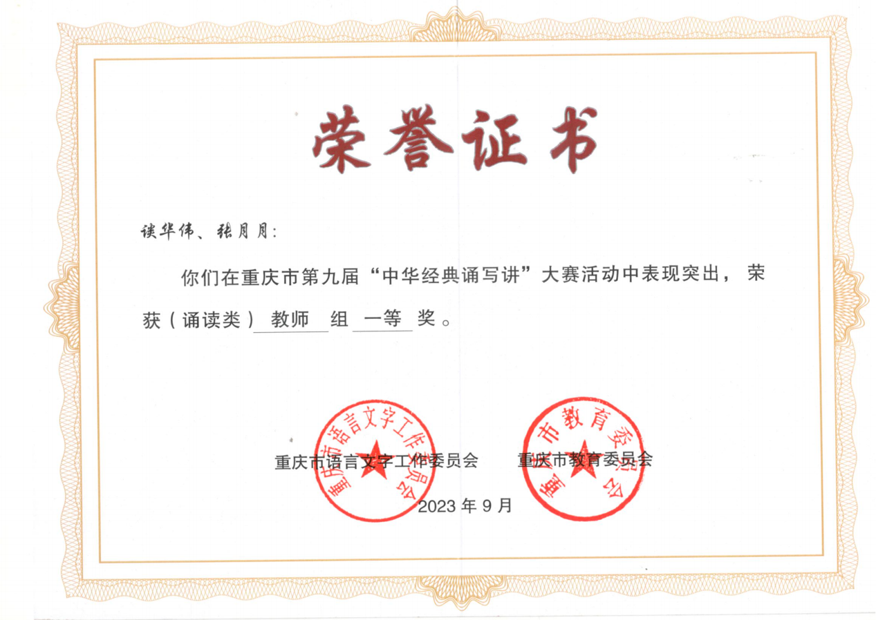 日前,重庆市教育委员会公示了2023年重庆市第九届“中华经典诵写讲”大赛(诵读类)获奖名单,bat365官网文学与新闻学院谈华伟、张月月博士作品《长江自有后来人》获教师组一等奖。
