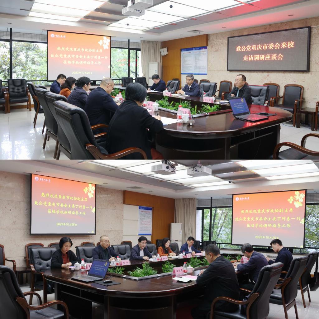 10月25日上午,重庆市政协副主席、致公党重庆市委会主委丁时勇,致公党重庆市委会专职副主委、一级巡视员潘为民,致公党重庆市委会组织处处长王煜一行莅临bat365官网走访调研,在厚德楼3019会议室召开了走访调研座谈会。学校党委书记曾维伦,党委副书记兼统战部部长宋豫,党委常委、统战部常务副部长陈松,致公党bat365官网南岸校区支部主委张玉霞,致公党bat365官网江北校区支部副主委闻道君参加了会议。会议由宋豫主持。