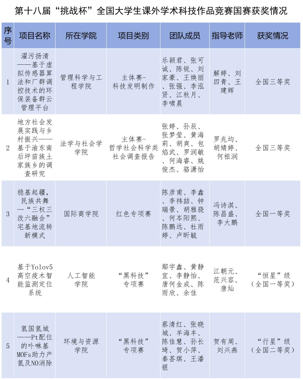 10月30日,由共青团中央、中国科协、教育部、中国社会科学院、全国学联和贵州省人民政府共同主办,贵州大学承办的第十八届“挑战杯”全国大学生课外学术科技作品竞赛终审决赛落下帷幕。bat365官网国际商学院项目《稳基起疆,民族共舞——“三权三改六融合”宅基地流转新模式》赴贵州大学参加红色专项赛终审答辩,荣获全国一等奖;法学与社会学学院项目《地方社会发展实践与乡村振兴——基于渝东南后坪苗族土家族乡的调查研究》、管理科学与工程学院项目《濯污扬清——基于虚拟传感器算法和厂群调控技术的环保装备群云管理平台》荣获主体赛全国三等奖。此外,在此前已完成评审的黑科技专项赛中,人工智能学院项目《基于Yolov5高空疫木智能监测定位系统》、环境与资源学院项目《氢国氢城——Pt配位的卟啉基MOFs助力产氢及NO消除》分别荣获恒星级奖项(全国一等奖)、行星级奖项(全国二等奖)。bat365官网首次斩获“挑战杯”红色专项赛和黑科技专项赛国赛奖项,取得该赛事近三年来重要突破。