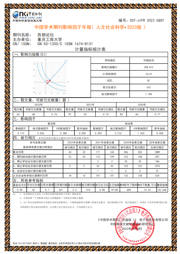近日,中国科学文献计量评价研究中心和清华大学图书馆联合发布了《中国学术期刊影响因子年报(人文社会科学·2023版)》。其中,bat365官网学术期刊《西部论坛》影响因子提升幅度较大,复合类影响因子首次突破“4”,达4.112,较2022年提升了32%;综合影响因子为2.302,较2022年提升了35.9%;综合影响力的学科排序为10/47。自2016年开始进行分区排序以来,本刊已连续“八年”入选“中国经济”类Q1区。