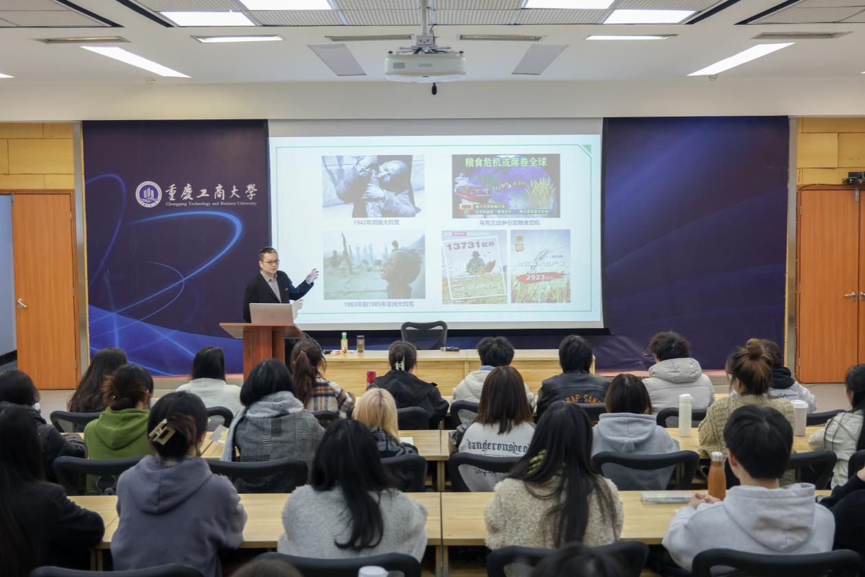 课上,温涛从习近平总书记关于总体国家安全观的重要论述入手,从“保证国家安全是头等大事”“必须坚持总体国家安全观”“开创国家安全工作新局面”等三个方面作了详细讲解。温涛以粮食安全为例,强调粮食安全是“国之大者”,引导同学们思考“中国的粮食安全谁来守护、如何守护?”。结合相关经济学原理和金融学知识,他向同学们介绍了粮食安全问题研究相关前沿问题,分析了当前国家粮食安全新形势,阐述了党的二十大报告和中央农村工作会议中的相关内容,教育引导同学们牢记习近平总书记关于“中国人的饭碗任何时候都要牢牢端在自己手中”的谆谆嘱托。温涛指出,坚持总体国家安全观,“总体”是关键所在,要有“大安全”理念,要认识到总体国家安全观的五大要素、五对关系、五个统筹以及贯彻落实中的“十个坚持”。党的十八大以来,以习近平同志为核心的党中央高度重视国家安全,健全了国家安全体系,增强了维护国家安全能力,提高了公共安全治理水平,健全了社会治理体系,开创了国家安全工作新局面。