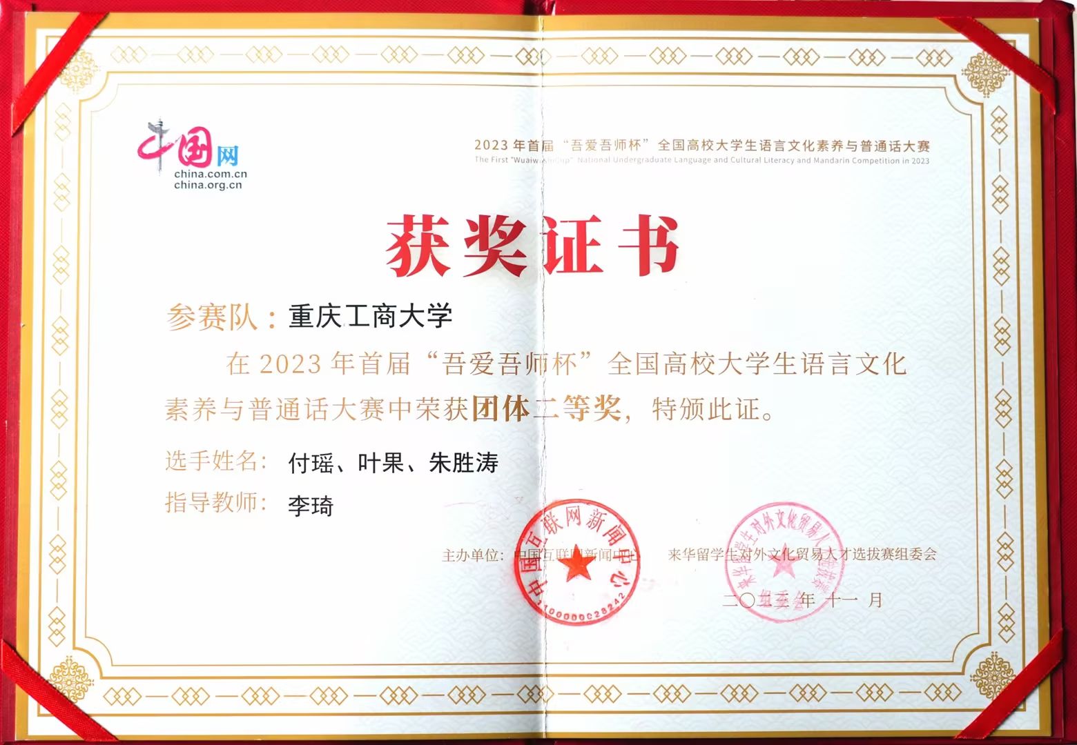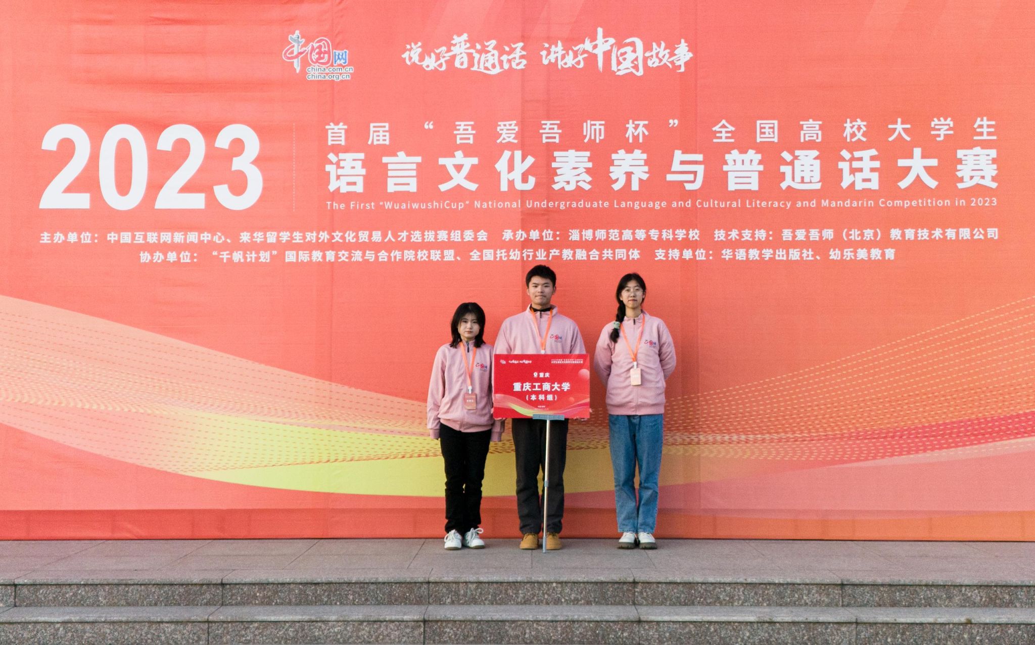 11月17日-19日,由中国互联网新闻中心、来华留学生对外文化贸易人才选拔赛组委会共同主办的首届“吾爱吾师杯”全国高校大学生语言文化素养与普通话大赛在山东淄博师范高等专科学校举行,bat365官网文学与新闻学院2021级叶果、朱胜涛同学与金融学院2022级付瑶同学在指导教师李琦老师的指导下,在大赛中获得全国总决赛(本科组)团体二等奖。