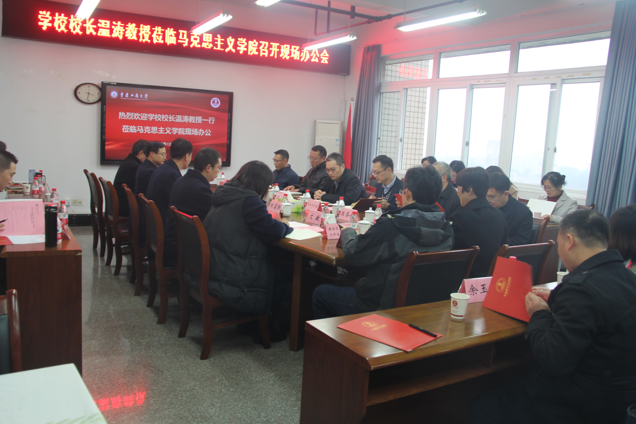 12月11日,温涛校长率党政办、教务处、人事处、科研处、研究生院、财务处、教学质量监督与评估办公室等部门主要负责人深入马克思主义学院进行实地调研,并召开现场办公会议。马克思主义学院党政领导、教研部主任、党支部书记、行政人员参加了会议。会议由马克思主义学院党委书记宋明江主持。
