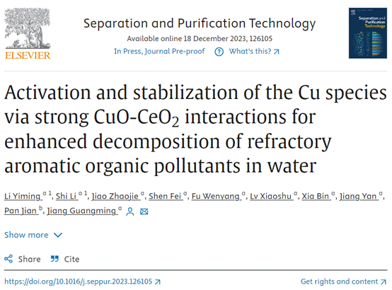 近日,bat365官网废油资源化技术与装备教育部工程研究中心硕士研究生李熠明和石力,在导师焦昭杰和蒋光明研究员的联合指导下,在关于含油废水中难降解有机物去除方面取得了重要进展,在国际学术期刊《Separation and Purification Technology》发表了题为“Activation and stabilization of the Cu species via strong CuO-CeO2interactions for enhanced decomposition of refractory aromatic organic pollutants in water”(CuO-CeO2强相互作用活化和稳定的Cu产物对水中难分解芳香族有机污染物的强化降解)的学术论文(https://doi.org/10.1016/j.seppur.2023.126105),标志着废油中心在含油废水净化处理领域的研究取得了新进展。