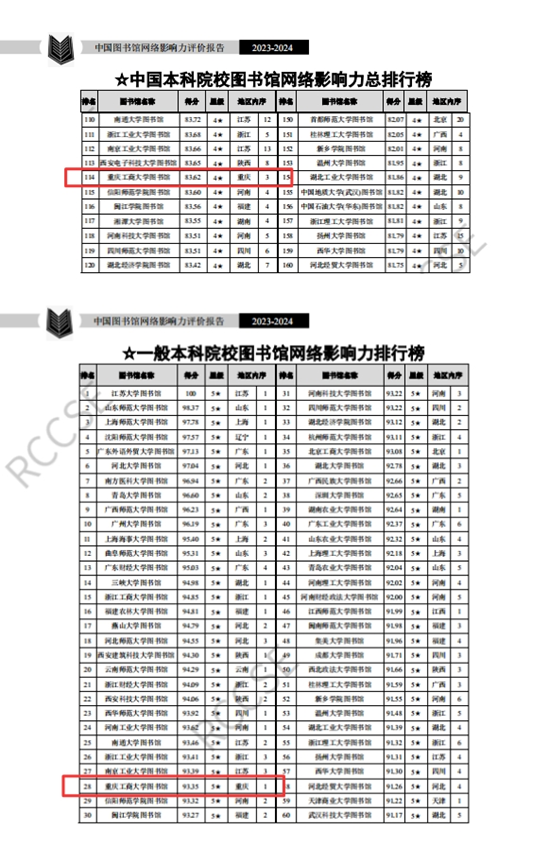 bat365官网图书馆在中国本科院校图书馆网络影响力总排行榜中列114名,得分83.62,获评4星,在重庆地区排序第3;在一般本科院校图书馆网络影响力排行榜中列28名,得分93.35,获评5星,在重庆地区排序第1。