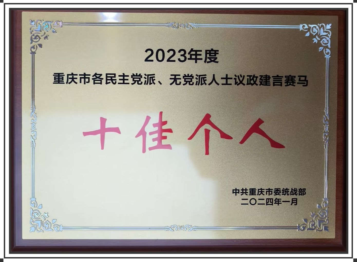 1月15日,2023年度重庆市各民主党派、无党派人士议政建言赛马总结表彰大会召开。市委常委、统战部部长卢红出席会议并讲话。民革市委会主委、市政协副主席王新强,民盟市委会主委、市政协副主席杜惠平,民进市委会主委、市政协副主席陈贵云,农工党中央副主席、市委会主委,市政府副市长但彦铮,致公党市委会主委、市政协副主席丁时勇,台盟市委会主委、市政协副主席王昱出席会议。会议通报了2023年度全市各民主党派、无党派人士议政建言情况,颁发了议政建言十佳案例、十佳个人、十佳组织奖。