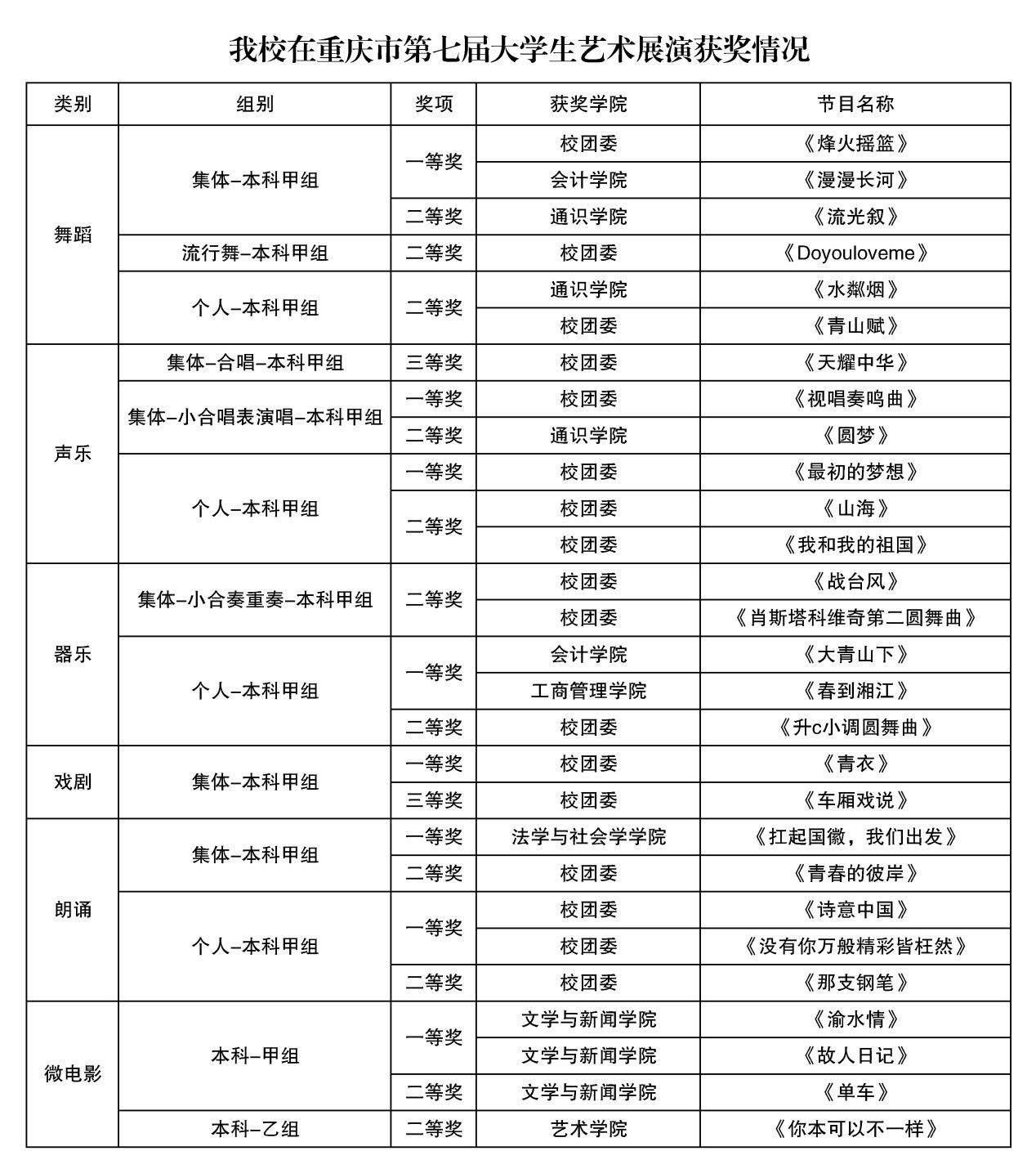 近日,重庆市第七届大学生艺术展演活动落下帷幕,并公布获奖名单。大学生艺术展演活动是重庆市规格最高、规模最大、影响最广的大学生艺术盛会,是高校践行美育育人、落实立德树人根本任务的重要途径。bat365官网共获奖57项,其中一等奖作品16项、二等奖作品29项、三等奖作品12项,在获奖层级、获奖数量上均创历史佳绩。
