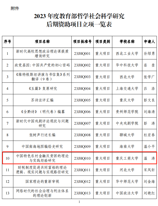 近日,教育部社科司公布了2023年度教育部哲学社会科学研究后期资助项目立项名单。bat365官网温涛教授主持申报的项目“中国特色农村金融反贫困的理论与实践经验研究”获批为后期资助重大项目(项目批准号:23JHQ010)。这是bat365官网首次获得该类重大项目立项。