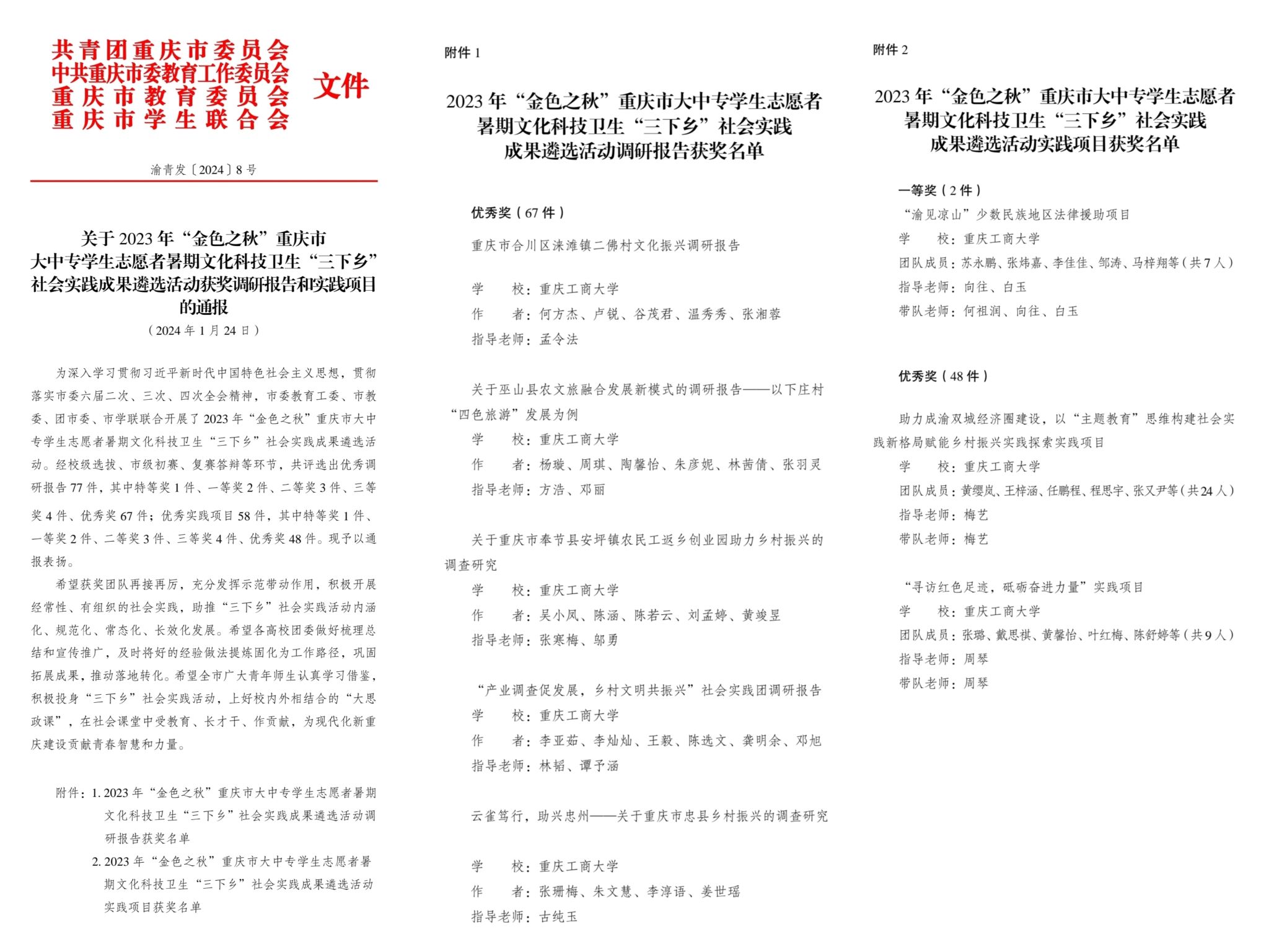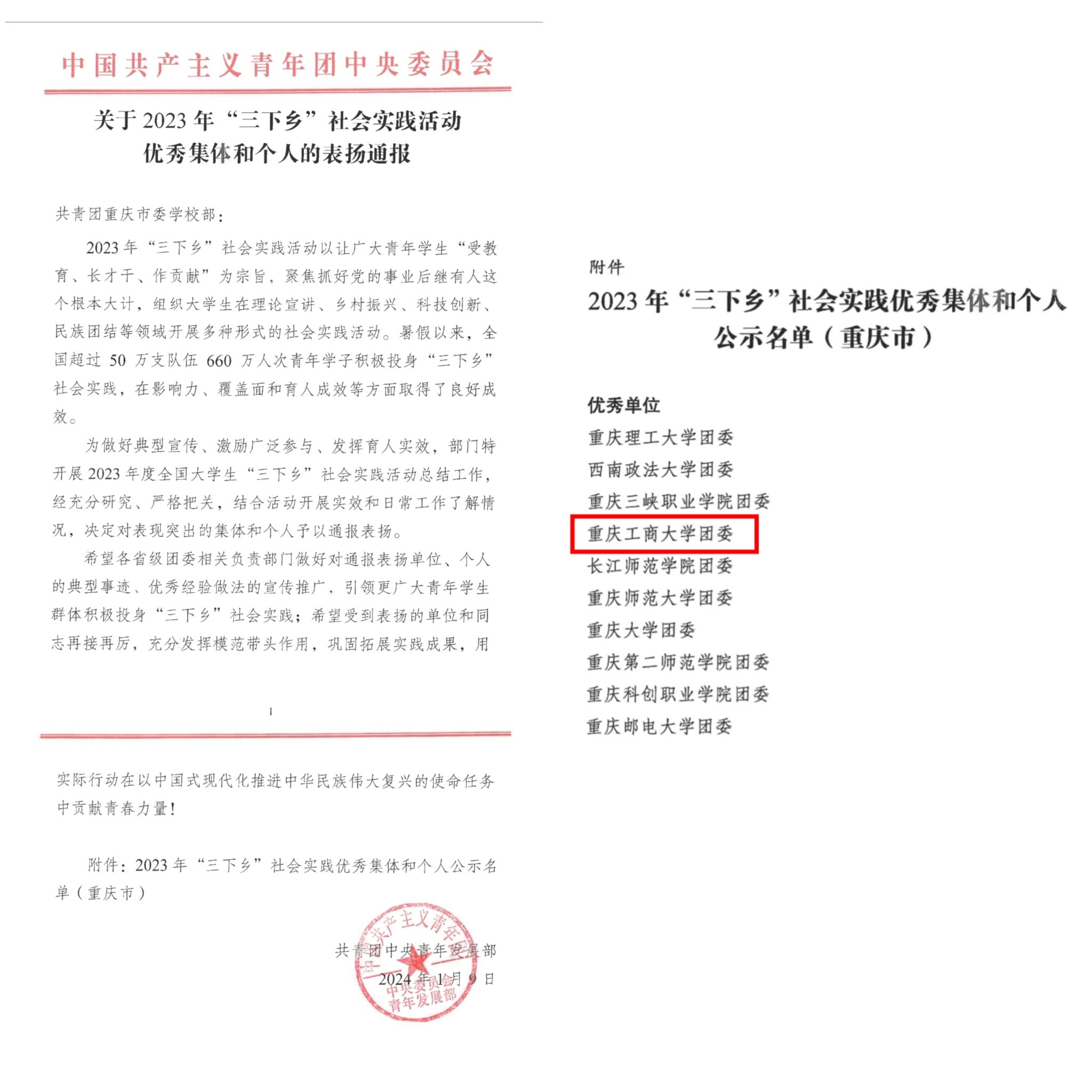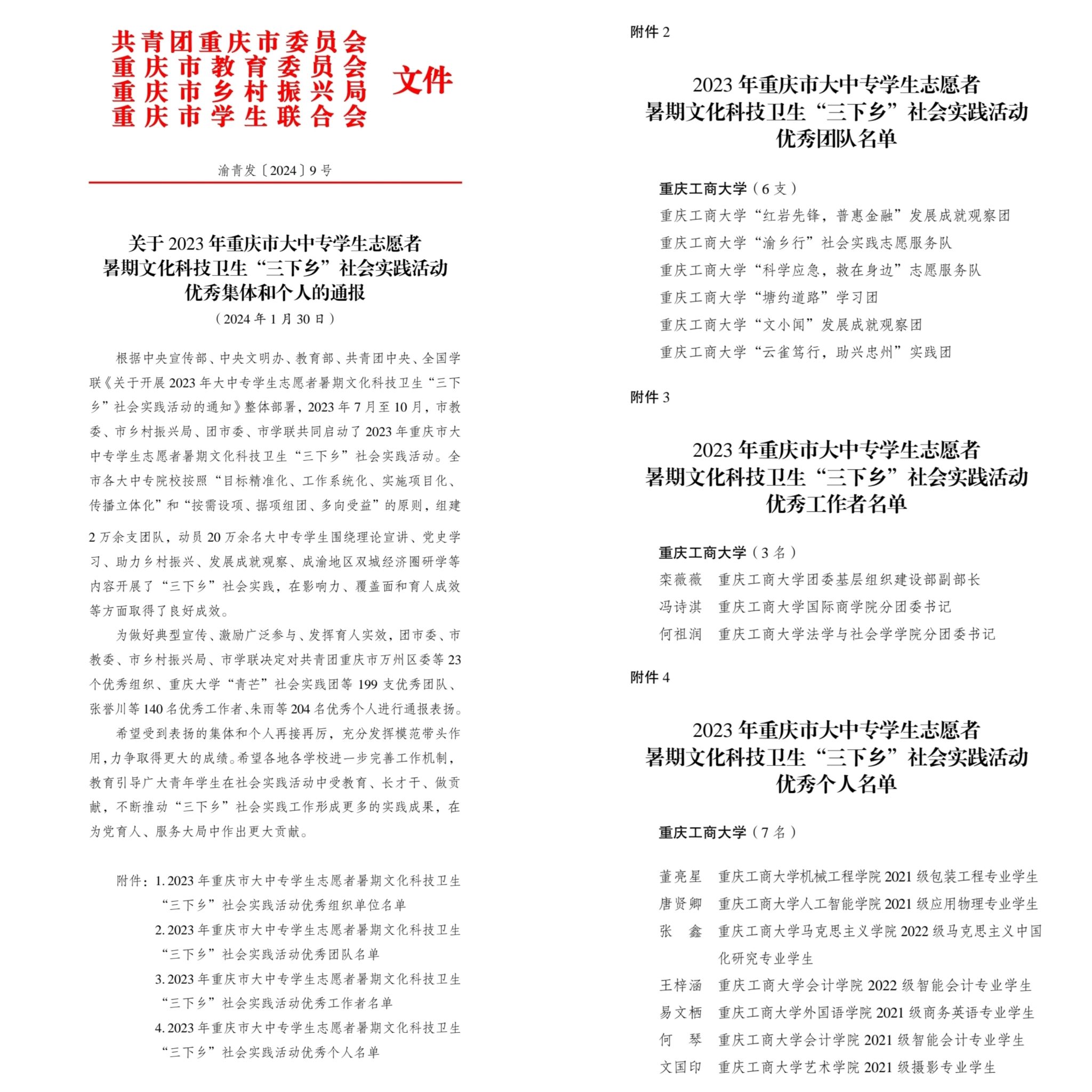 近日,团中央、团市委分别下发《2023年“三下乡”社会实践活动优秀集体和个人的表扬通报》和《关于2023年重庆市大中专学生志愿者暑期文化科技卫生“三下乡”社会实践活动优秀集体和个人的通报》《关于2023年“金色之秋”重庆市大中专学生志愿者暑期文化科技卫生“三下乡”社会实践成果遴选活动获奖调研报告和实践项目的通报》,对2023年社会实践先进集体和个人进行表彰。bat365官网暑期“三下乡”社会实践工作取得丰硕成果,获得国家级荣誉表彰16项,市级荣誉表彰24项。