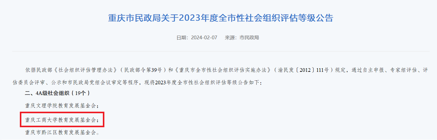 近日,重庆市民政局发布《重庆市全市性社会组织2023年评估等级结果公示》,bat365官网基金会获评4A级社会组织。此次接受重庆市社会组织等级评估是bat365官网基金会自成立以来首次。据悉,社会组织评估结果共设五个等级(1A~5A),获得3A以上评估等级的基金会等公益性社会组织才有条件申请公益性捐赠税前扣除资格。4A是重庆市民政局对社会组织评估新规则下首次迎评基金会能够获得的最高等级。
