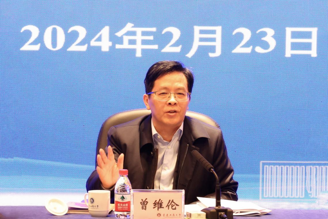 曾维伦在讲话中指出,今年学校工作重心就是坚持党建引领,强化改革攻坚,推动学校事业发展实现突破跃升。学校改革攻坚是应对科技变革的需要,是服务国家高质量发展战略的需要,是建设现代化高水平大学目标的需要。一要做好人才培养模式改革,培养出更多适应社会需要的人才;二要做好学科建设,特别是做好申博和一流学科建设工作;三要做好科学研究工作,推进有组织科研,产出服务国家战略的标志性成果;四要做好人才队伍建设,尤其是抓好高层次领军人才培养和干部队伍建设;五要做好校园软硬件建设,通过新校区建设和校园文化建设,更好满足学校教学、科研、人才培养需要;六要做好党建工作,对标借鉴全市“885”工作机制,实现学校党建工作量化、细化、可视化。针对学校2024年全面加强党的建设,曾维伦谈到:一要加强党的政治建设,坚决拥护“两个确立”,坚决做到“两个维护”;二要做好“一融双高”,以高质量党建引领学校事业高质量发展;三要抓好干部队伍能力提升;四要做好意识形态工作;五要树立“大思政”格局,做好思想政治工作;六要做好统战群团工作;七要抓好全面从严治党。
