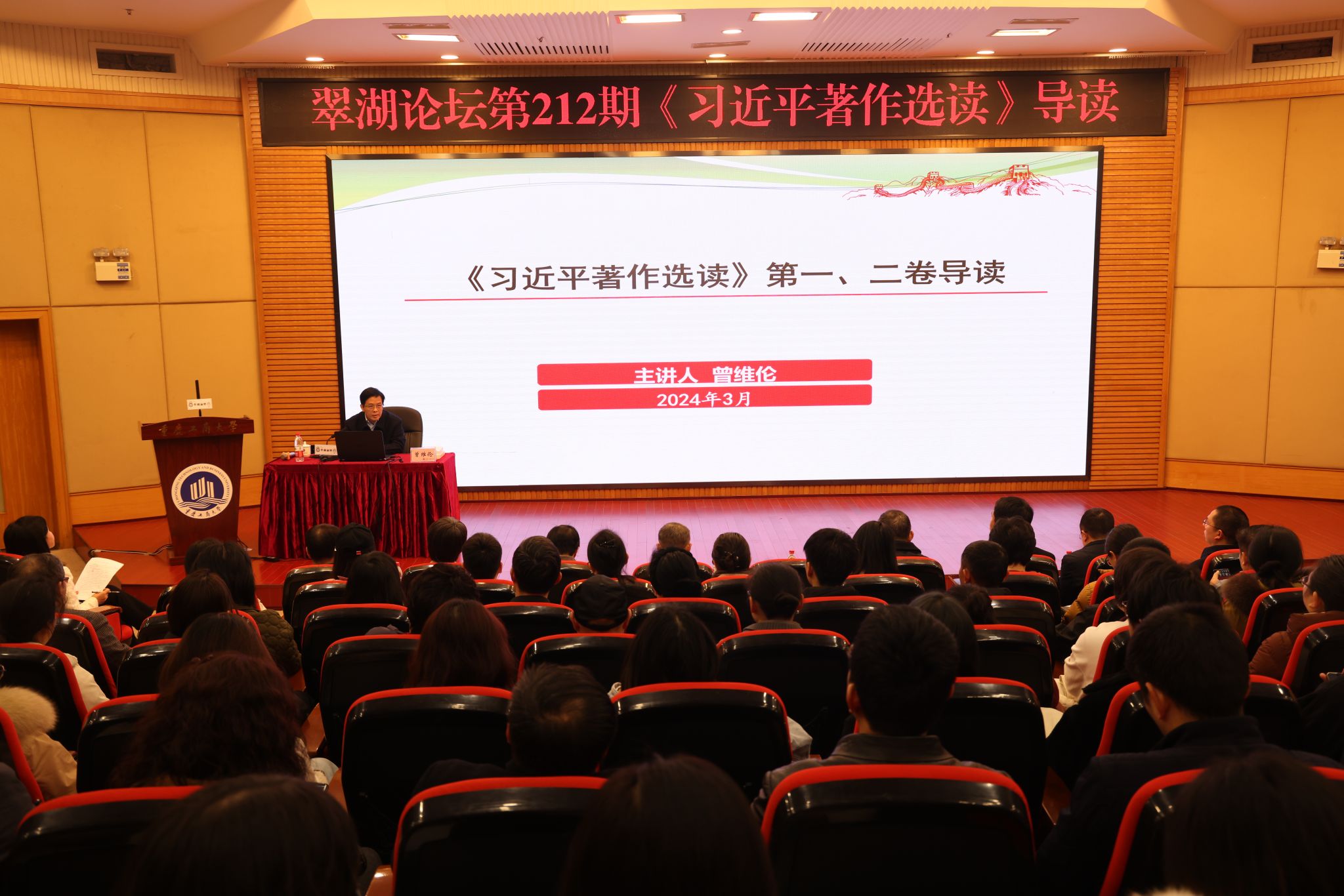 3月8日上午,bat365官网在博智楼7200报告厅举办翠湖论坛第212期《习近平著作选读》导读讲座。翠湖论坛由学校图书馆主办,邀请了学校党委书记曾维伦作专题讲座。学校党委常委、副校长陈运超,相关职能部门负责人和师生代表250余人参加。