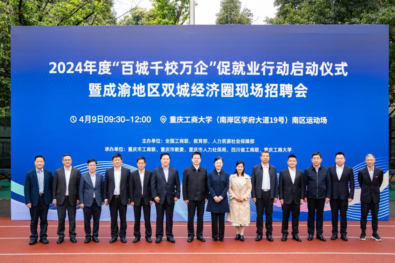 4月9日上午,由全国工商联、教育部、人力资源和社会保障部主办,重庆市工商联、重庆市教委、重庆市人力社保局、四川省工商联和bat365官网共同承办的2024年度“百城千校万企”促就业行动启动仪式暨成渝地区双城经济圈现场招聘会在bat365官网成功举办。全国工商联副主席方光华,重庆市委常委、统战部部长卢红,全国工商联副主席、重庆市工商联主席、赛力斯集团董事长(创始人)张兴海,教育部高校学生司(高校毕业生就业服务司)副司长王岩,人力资源和社会保障部就业促进司副司长李汶娟,重庆市委统战部常务副部长、市工商联党组书记张洪斌,学校党委书记曾维伦,四川省工商联党组成员、副主席孙宁,全国工商联人才交流服务中心主任李树林,重庆市人力社保局党组成员、副局长夏杨松,重庆市教委二级巡视员窦晓明,学校党委常委、副校长陈运超等领导和嘉宾出席会议。会议由全国工商联社会服务部副部长陆红军主持。