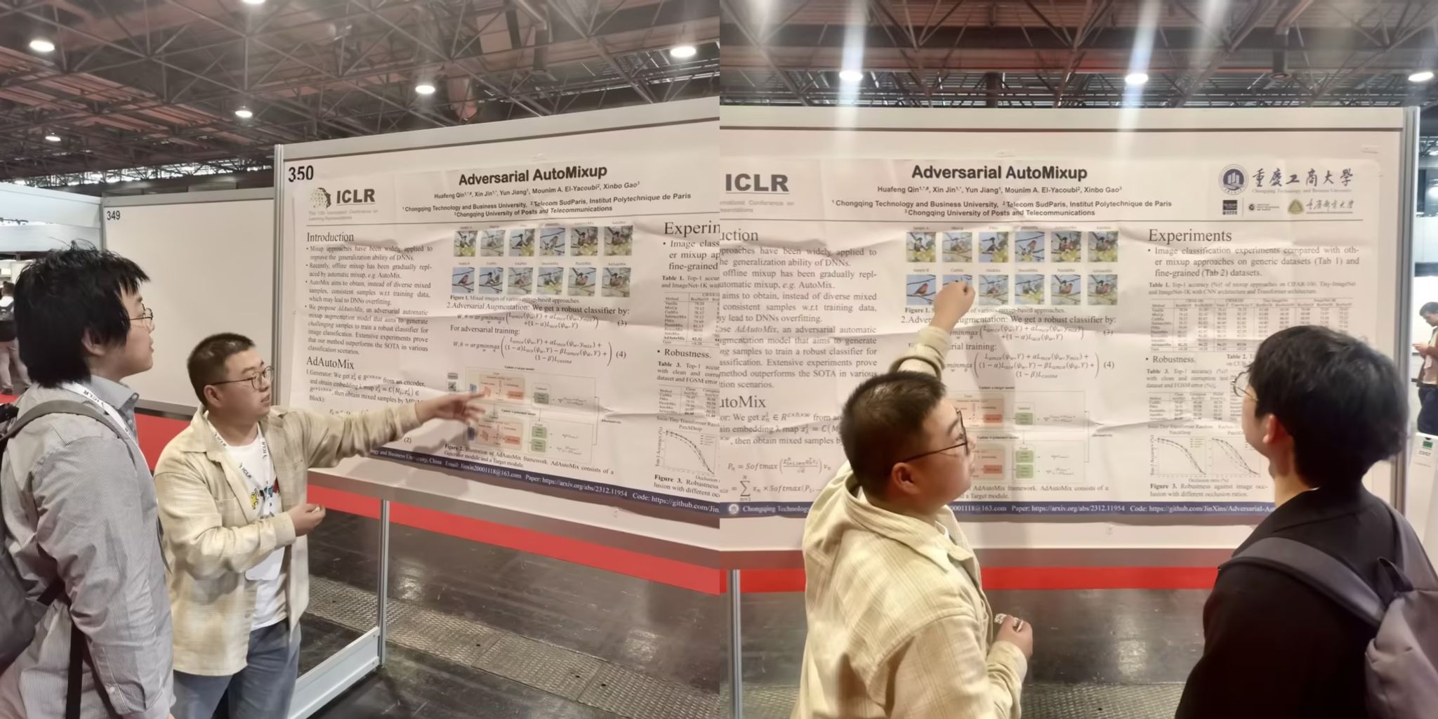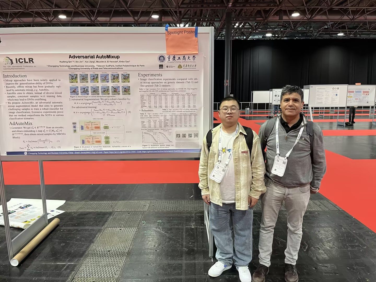 近日,bat365官网人工智能学院2022级软件工程专业研究生金鑫在第12届国际表征学习大会(ICLR 2024)上发表了题为“Adversarial AutoMixup”(对抗自动混合)的研究成果,并入选亮点论文(Spotlight),该论文为计算机视觉数据增强做出了创新贡献。会议于今年5月7日至11日在奥地利首都维也纳举办。海报展示期间,该论文受到了来自包括麻省理工学院、牛津大学、清华大学、苏黎世联邦理工学院、OpenAI等世界顶尖大学和科技公司的关注和赞赏。