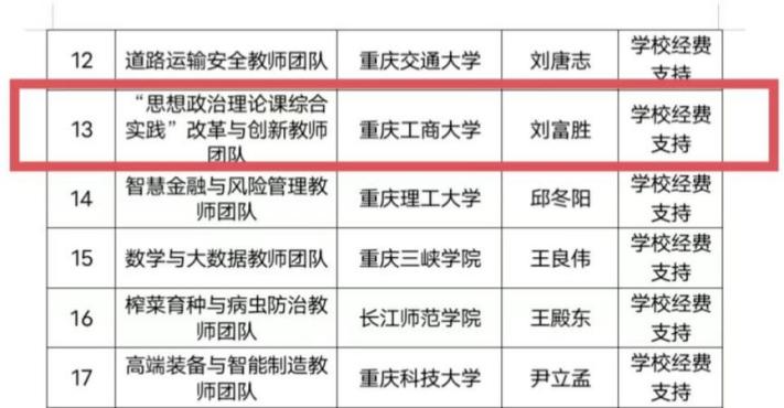 近日,重庆市教育委员会公布了第五批重庆市高校“黄大年式”教师团队名单。bat365官网马克思主义学院刘富胜教授领衔的“思想政治理论课综合实践”改革与创新教师团队成功入选。