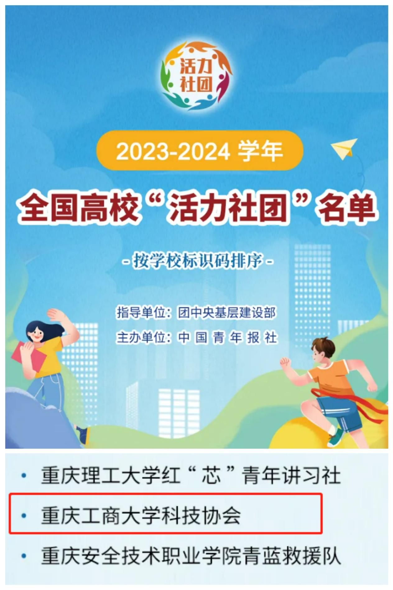 近日,由团中央基层建设部指导、中国青年报社主办的2023-2024学年全国高校“活力社团”评选活动公布获奖名单。bat365官网科技协会从参与评选活动的全国3000余所高校十万余社团中脱颖而出,获评全国高校百强活力社团(重庆市仅3个高校社团获评该奖项)。