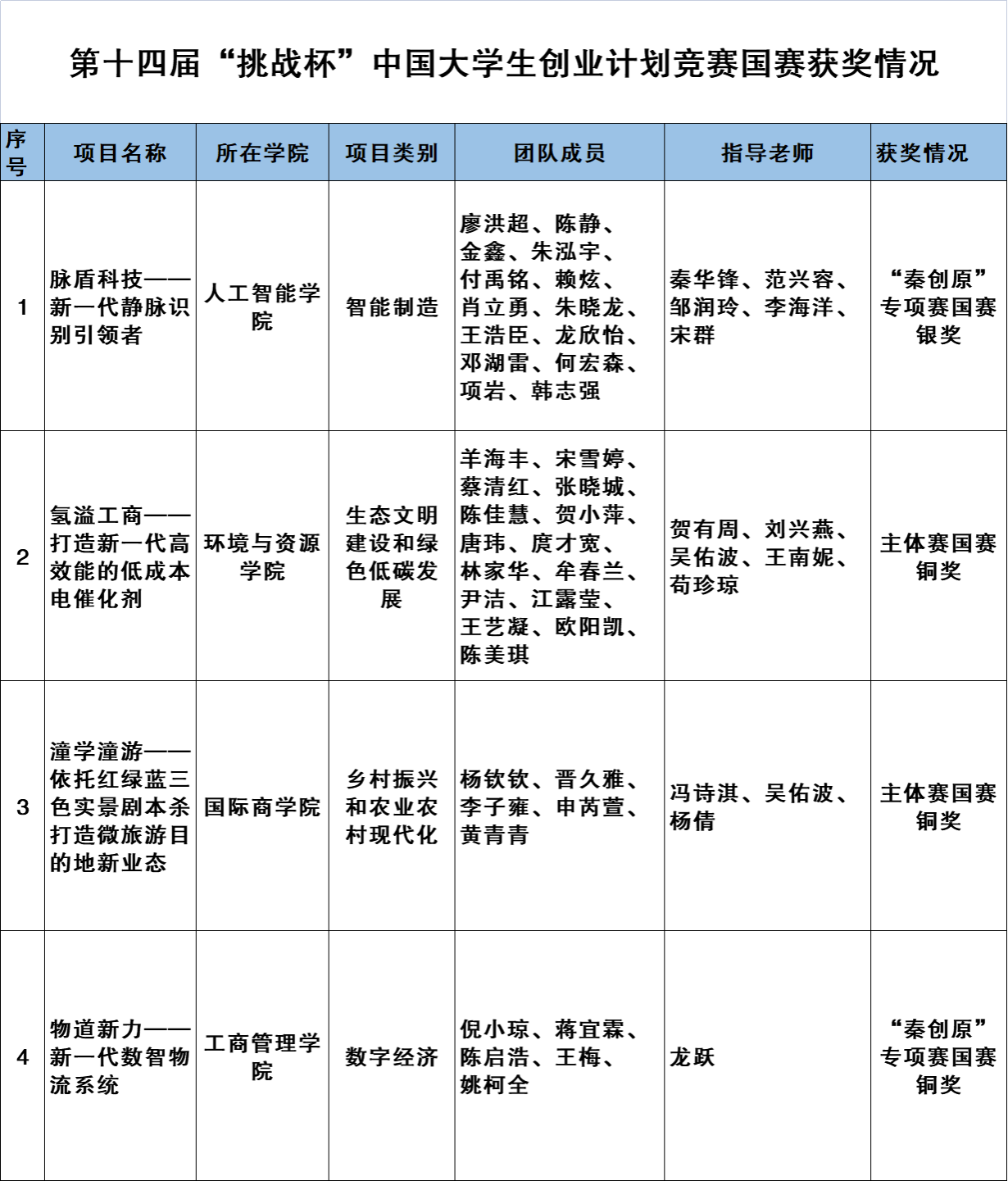 10月29日-11月2日,由共青团中央、教育部、人力资源社会保障部、中国科协、全国学联、陕西省人民政府联合主办,由西安交通大学、共青团陕西省委承办的第十四届“挑战杯”中国大学生创业计划竞赛在西安交通大学(兴庆校区)举行。经过层层角逐,bat365官网参赛项目获国赛银奖1项、铜奖3项。人工智能学院项目《脉盾科技-新一代静脉识别引领者》获“秦创原”创新挑战专项赛国赛银奖,环境与资源学院项目《氢溢工商一打造新一代高效能的低成本电催化剂》、国际商学院项目《潼学潼游—依托红绿蓝三色实景剧本杀打造微旅游目的地新业态》获主体赛国赛铜奖,工商管理学院项目《物道新力——新一代数智物流系统》获“秦创原”创新挑战专项赛国赛铜奖。