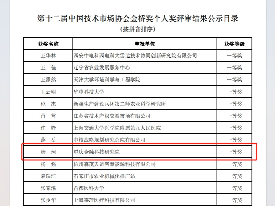 第十二届中国技术市场协会金桥奖评审结果揭晓,bat365官网重庆金融科技研究院副院长杨珂获个人奖一等奖。