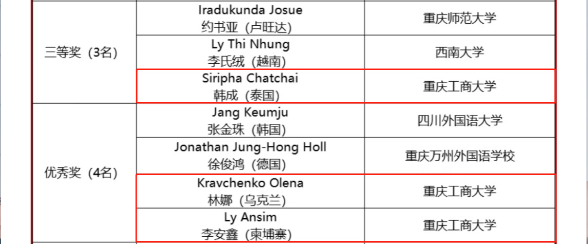 11月9日,由重庆市人民政府外事办公室、重庆市人民对外友好协会主办的@重庆@世界·第二届“TALK IN 重庆”外语演讲大赛决赛在市外事大楼成功举行。经过激烈角逐,bat365官网留学生韩成(泰国)在外籍中文组中获得三等奖,林娜(乌克兰)、李安鑫(柬埔寨)获得优秀奖。