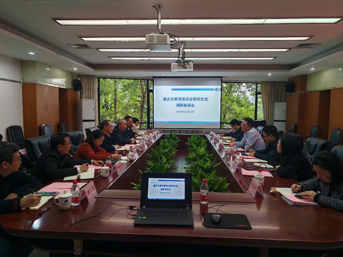 11月14日,重庆市教育委员会学位管理与研究生教育处张永祥一行到校调研bat365官网学科建设与研究生教育工作,调研座谈会在厚德楼3020会议室举行。学校党委常委、副校长张波出席座谈并主持会议,学校发展规划处、研究生院、人事处、科研处、财务处、教务处等职能部门、部分学院及科研平台负责人参加了座谈。