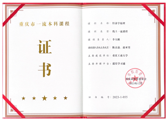 学院教师曾获重庆市政府颁发的高等教育教学成果一、二等奖;学院《经济学原理》《宏观经济学》分别认定为2023年重庆市高校一流本科课程、重庆市高校来华留学英语授课一流本科课程。