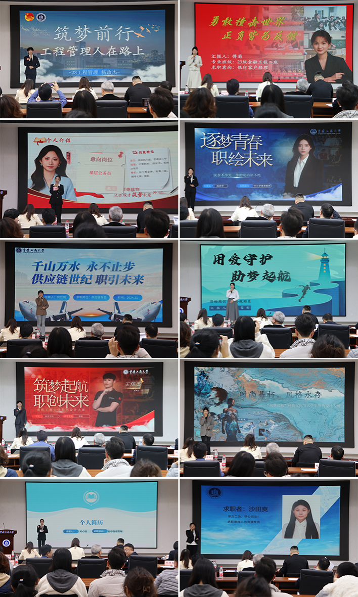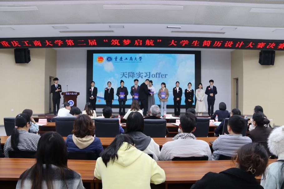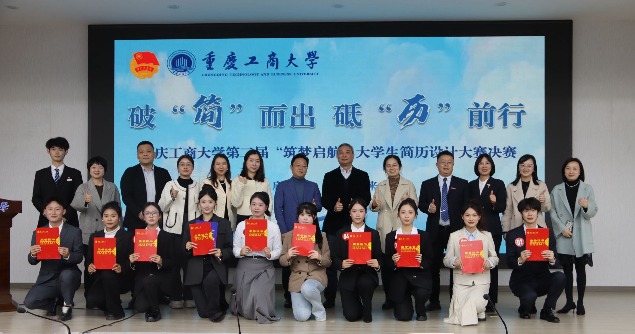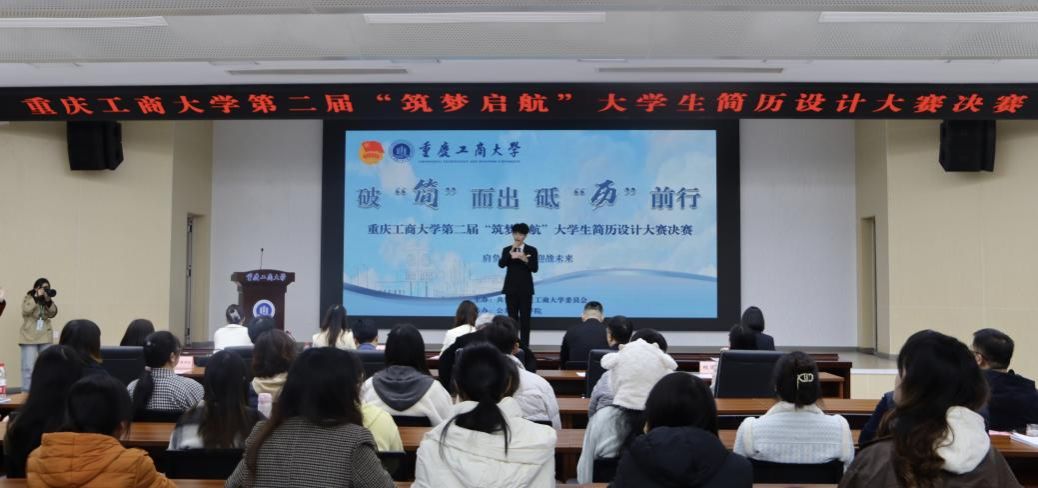 11月22日,由校团委主办、公共管理学院承办的bat365官网第二届“筑梦启航”大学生简历设计大赛决赛于南岸校区明德楼1019报告厅举办。党委常委、副校长李国军,团市委高校工作部副部长刘丽霞,党委学工部部长申卫东,校团委书记吴佑波、副书记王微,公共管理学院党委书记陆嘉、副书记谢书楠与现场200余名同学共同观摩比赛。大赛邀请了中国电信重庆南岸分公司党委委员、副总经理侯思羽,招商银行重庆分行人力资源部副总经理王肖潇,智联招聘重庆分公司总经理杨帆,赛力斯集团股份有限公司校招负责人吴倩,珠海万达商管重庆分公司人事行政高级经理杨利担任评委。