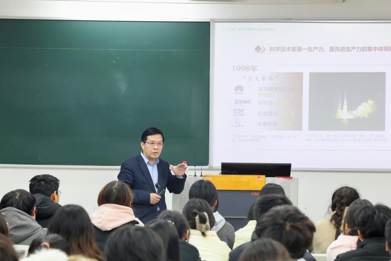 课堂上,曾维伦围绕“三个代表”重要思想这一主题,从“‘三个代表’重要思想的核心观点”“‘三个代表’重要思想的主要内容”“‘三个代表’重要思想的历史地位”三个方面进行深入讲解。