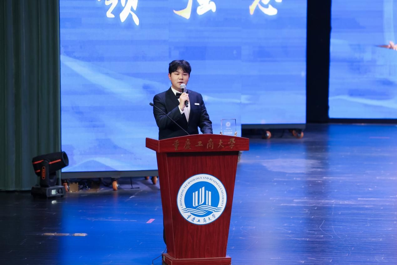 往届校长荣誉奖获得者代表、金融学院2014级税收学专业毕业生、现就职于国家税务总局刘润哲代表历届获奖者向母校及各位老师致以诚挚的感谢,同时也对此次获奖的团队和个人表示衷心的祝贺。他谈到,“校长荣誉奖”这份荣誉一直是他昂首挺胸、阔步前行的底气,让他从容地面对工作和生活中的各类挑战。他与学弟学妹们分享交流自身的感想和体会:一是要有坦荡通达的正气,立德修身,厚德载物。二是要有一专多能的才气,练就本领,博学笃行。三是要有勇攀高峰的志气,脚踏实地,求是求实。四是要有所向披靡的朝气,敢想敢干,守正创新。他希望大家以此次获奖的团队和个人为榜样,立报国强国大志向,做挺膺担当奋斗者,成为德智体美劳全面发展的社会主义建设者和接班人。