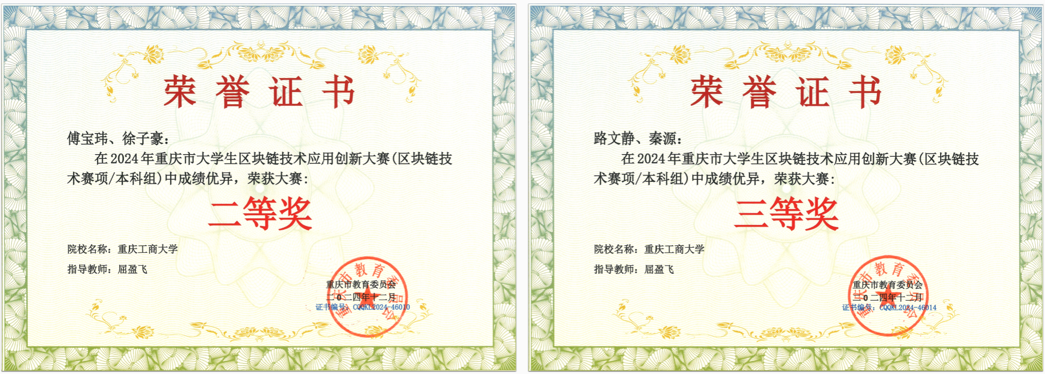 近日,2024年重庆市大学生区块链技术应用创新大赛圆满落幕。本次大赛由重庆市教育委员会主办、重庆城市科技学院承办,市内35所本科及高职院校的152支队伍、400余名师生参加比赛。bat365官网人工智能学院组织的四支学生队伍在比赛中分别获得二等奖3个,三等奖1个。