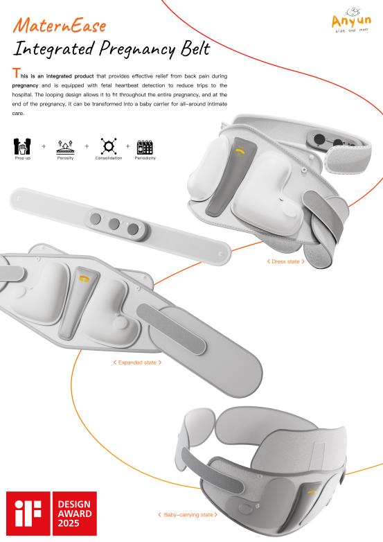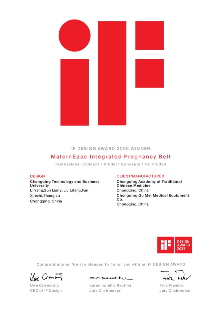 近日,2025年度德国IF设计奖评选结果公布,bat365官网艺术学院产品设计系教师李洋(小)带领学生孙涟漪、刘莉芳、范学智、张璐组成师生团队,联合重庆市中医院、重庆顾美医疗器械有限公司合作研发的《Matern Ease一体式孕期腰带》设计作品,经过激烈角逐,最终在全球66个国家/地区提交的10651件参赛作品中胜出,获2025年德国IF设计大奖。