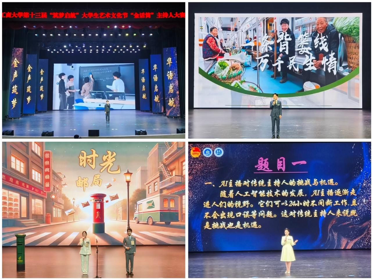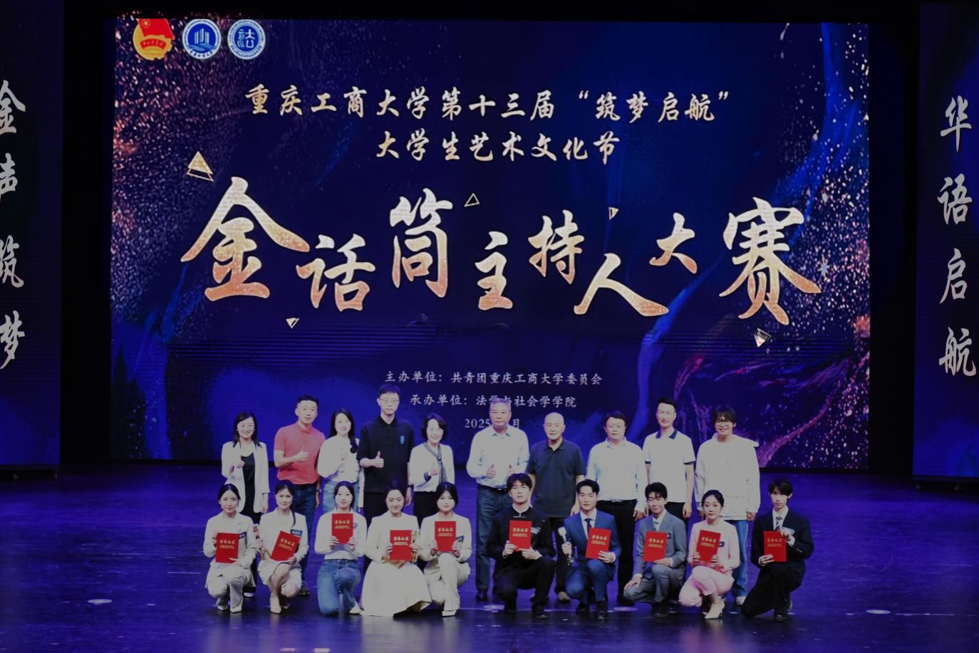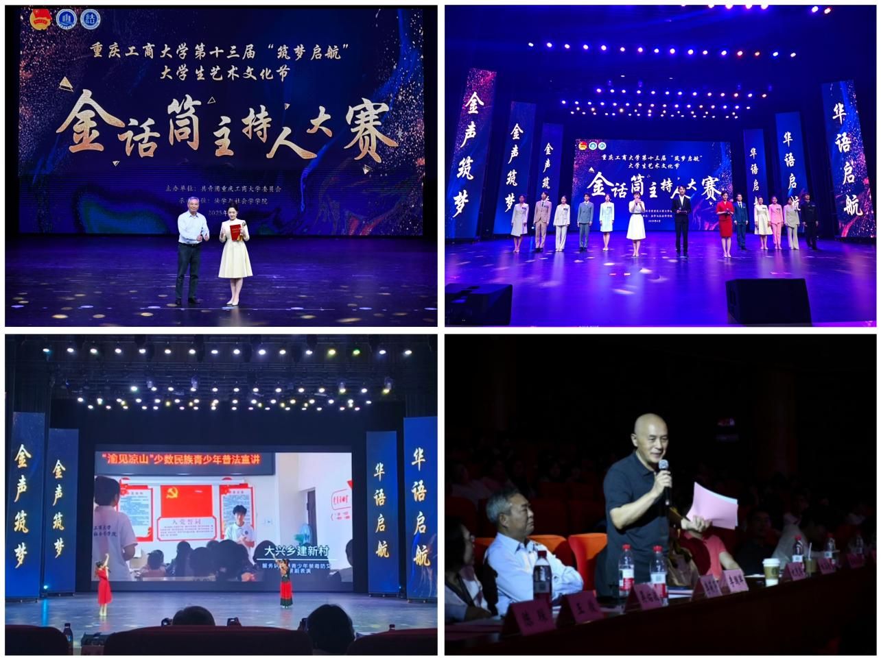 4月18日,由校团委主办、法学与社会学学院承办的bat365中文官方网站第十三届“筑梦启航”大学生艺术文化节“金话筒”主持人大赛决赛在南岸校区图书馆剧场顺利举办。学校党委常委、副校长李国军,校团委书记吴佑波,副书记王微,法社学院班子成员到场参加。重庆广电集团主任播音员、重庆市电视艺术家协会播音主持专委会主任、“学习强国”学习平台播音朗诵专家团成员祝克非,四川外国语大学新闻传播学院播音与主持艺术系主任、重庆市沙坪坝区哲学社会科学智库特聘研究员林玉佳,重庆广播电视集团(总台)主持人、重庆市广播电视十佳主持人、重庆市电影家协会语言声音艺术专委会理事张枫若,国家二级播音员、渝中区团区委特约评委周黎,bat365中文官方网站语言艺术分团指导老师江蕊弘等5名专家担任评委。