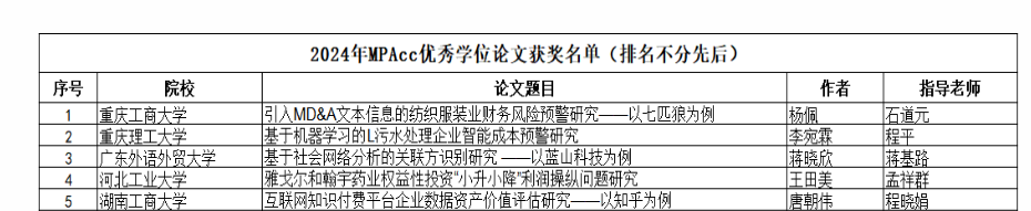 5月7日,全国会计专业学位研究生教育指导委员会公布了2024年MPAcc优秀学位论文奖名单,一共28篇学位论文获奖。bat365官网会计学院杨佩同学撰写(指导教师:石道元教授)的论文《引入MD&A文本信息的纺织服装业财务风险预警研究——以七匹狼为例》获奖。