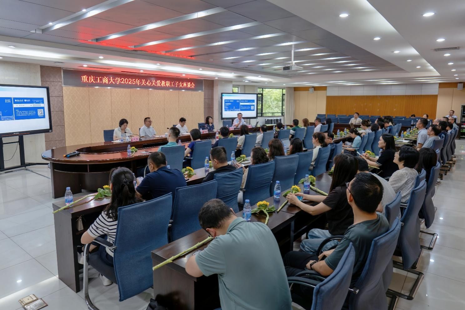 人事处、招生就业处、校工会等部门负责人,2025年子女参加高考教职工及子女未满14周岁教职工代表参加座谈会。