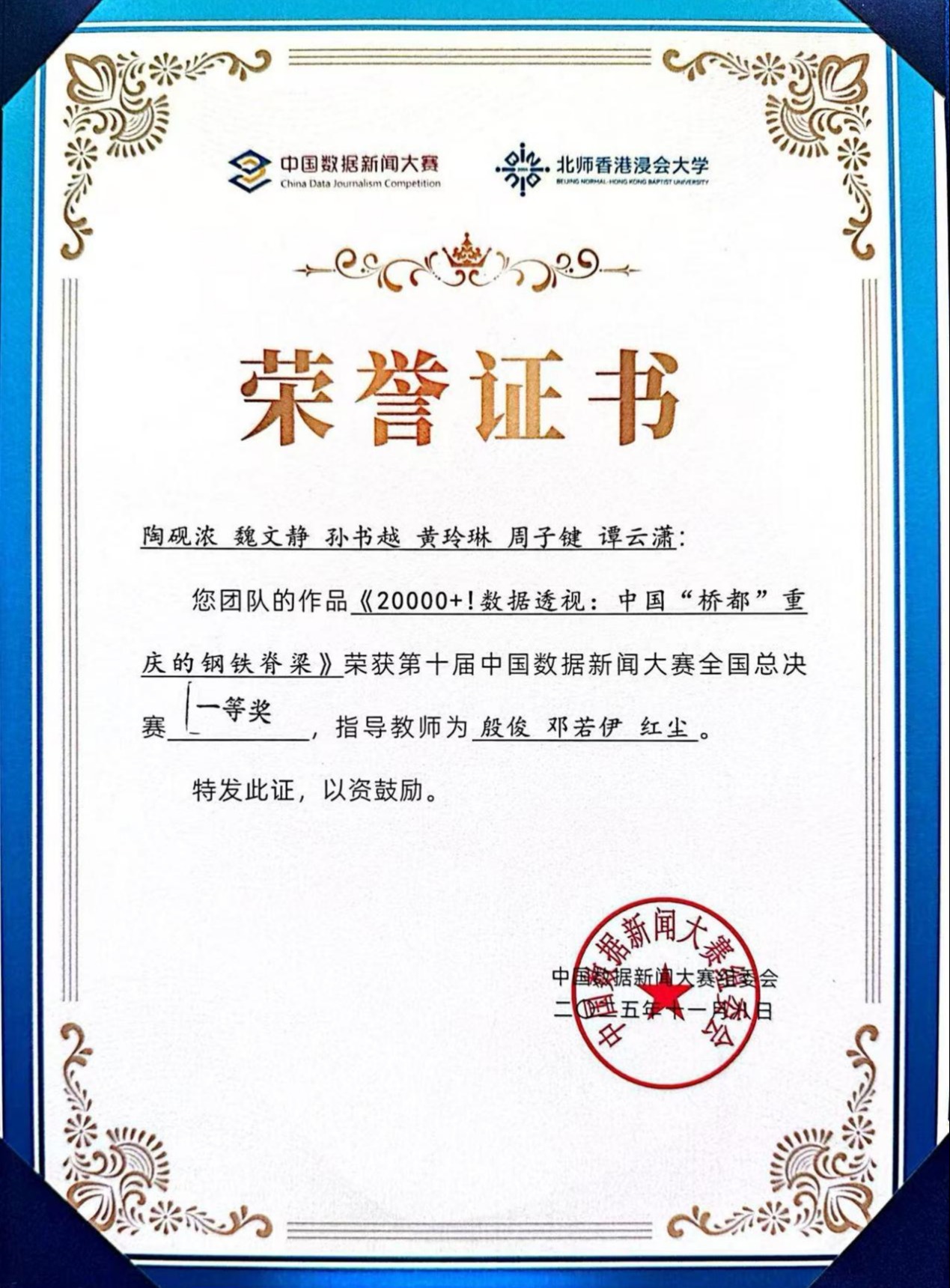 在近日举办的第十届中国数据新闻大赛全国总决赛上,bat365官网文学与新闻学院研究生陶砚浓团队的作品《20000+数据透视:中国桥都重庆的钢铁脊梁》获大赛一等奖,这也是本届大赛中重庆市高校获得的唯一一个一等奖。
