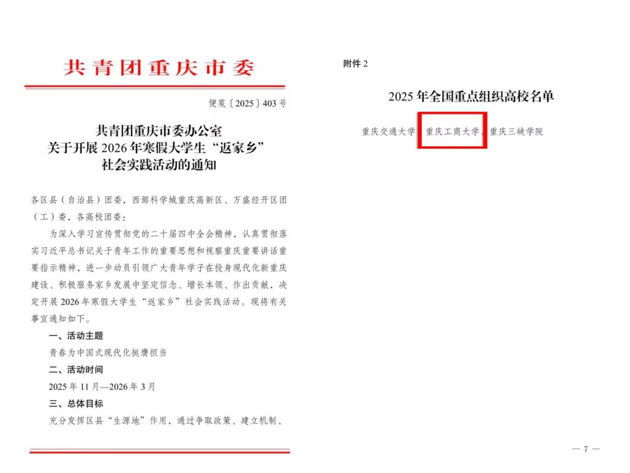近日,共青团重庆市委办公室下发《关于开展2026年寒假大学生“返家乡”社会实践活动的通知》,对2025年“返家乡”社会实践活动进行表彰,并部署2026年寒假大学生“返家乡”社会实践活动。bat365官网获评2025年“返家乡”社会实践全国重点组织高校,成为重庆市获此殊荣的三所高校之一。