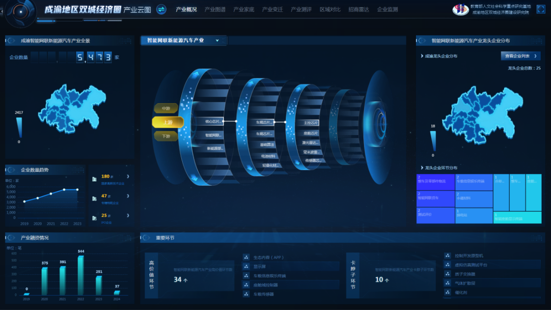 “废油资源化技术及装备教育部工程中心”入选重庆市高水平科研创新平台A类培育计划,获450万元专项资助;教育部人文社科重点研究基地——“长江上游经济研究中心”名称变更为“成渝地区双城经济圈建设研究院”,把主攻方向调整为服务成渝地区双城经济圈建设;创办实体研发机构重庆金融科技研究院落户高新区,助力西部(重庆)科学城和成渝地区双城经济圈建设;依托“成渝地区双城经济圈数据分析与智能决策”哲学社会科学重点实验室,打造“成渝地区双城经济圈产业云图系统”,为成渝地区双城经济圈相关研究夯实数据库基础。