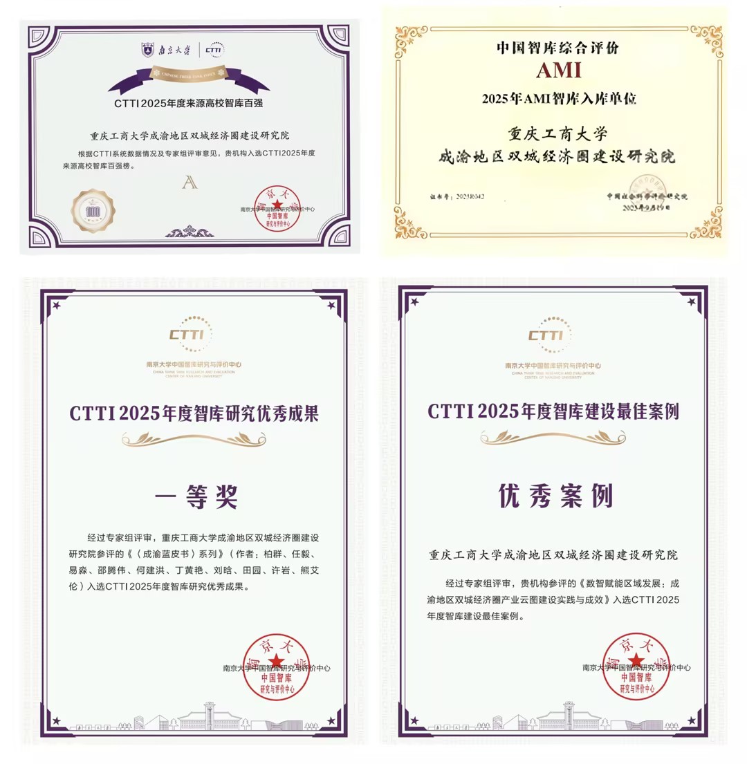 在资政服务方面,学校构建起“4+6”新型智库机构体系,其中市级新型重点智库“成渝地区双城经济圈建设研究院(长江上游经济研究中心)”入选CTTI来源智库和中国核心智库(AMI),连续四年获得重庆市重点新型智库年度“优秀”等级,并连续两届入选CTTI“高校智库百强榜”,多项成果入选CTTI智库建设优秀案例和优秀成果奖。