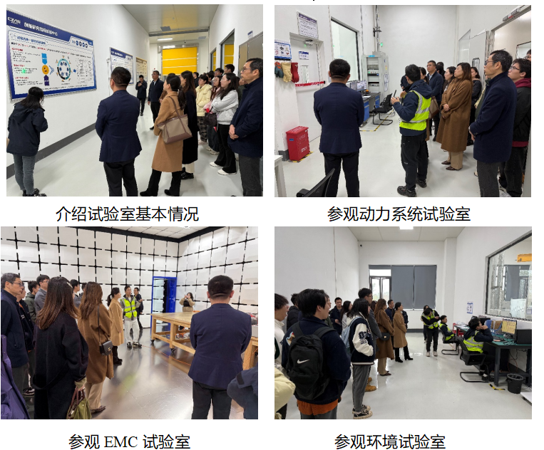 随后,学习团队一行来到辰致集团创新研究总院璧山试验中心,听取单位负责人介绍创新研究总院璧山试验中心试验能力规划、创新能力运行、试验仿真一体化验证体系,以及试验验证管理系统和仿真验证管理系统数字化平台建设情况。辰致集团创新研究总院璧山试验中心2025年2月正式投入运营使用,主要进行长周期及可靠性试验,拥有主要检测设备40余套,包含环境试验室、EMC试验室、动力系统试验室、功率半导体试验室及热管理试验室,旨在整合试验资源,支持重点项目攻关,提升仿真测试能力,并为成员单位提供测试服务。试验室覆盖了电控、电源、电驱等产品的多项国际和国家标准测试服务,同时构建了数字驱动、虚实融合的试验验证体系,推进仿真和试验一体化体系建设,缩短测试周期,降低成本。学习团队参观了EMC试验室、动力系统试验室、环境试验室等,切身体会以科技创新引领产业创新在汽车产业发展中的应用实践。