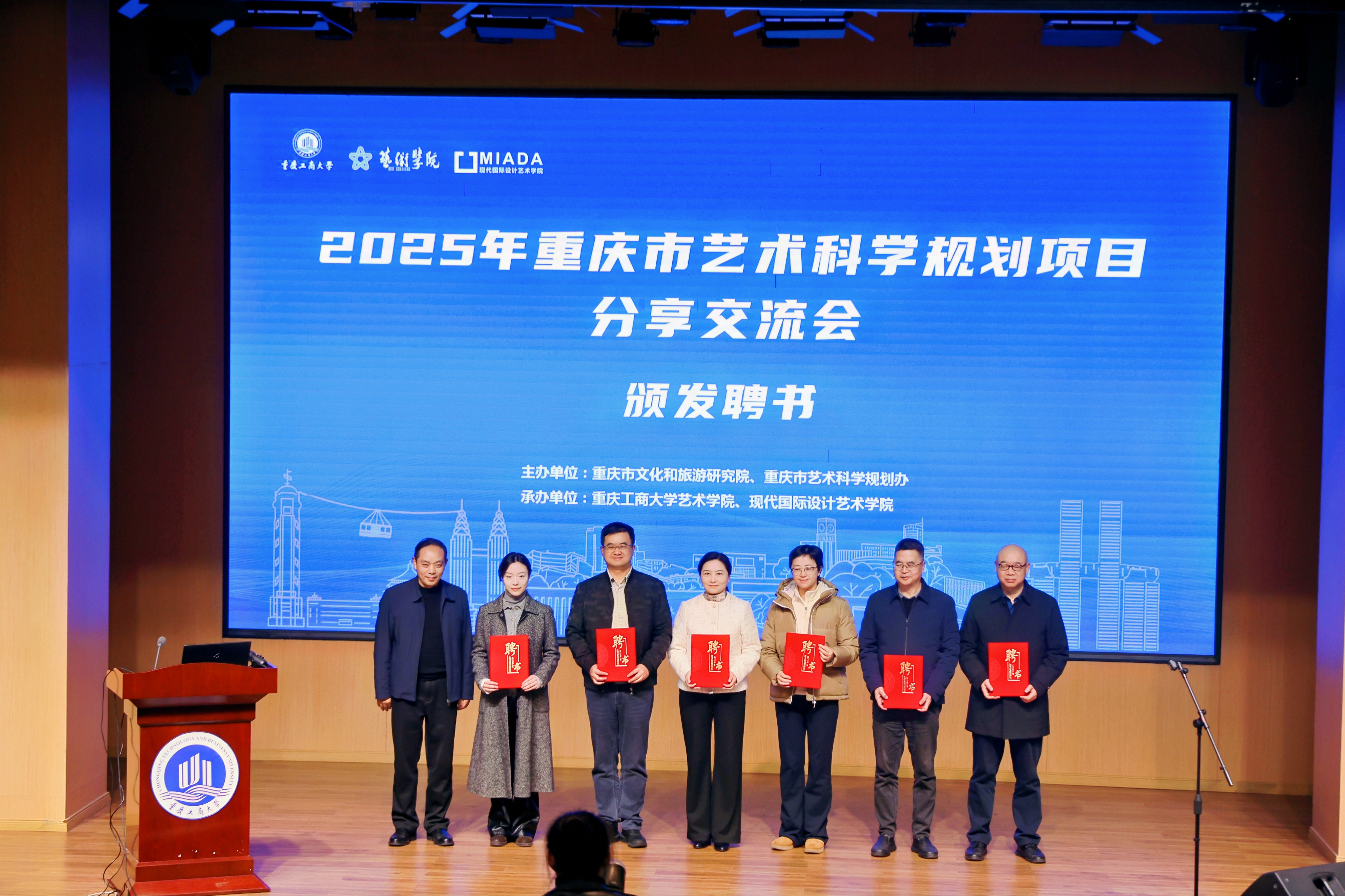 任毅代表bat365中文官方网站致辞。牟元义通报2025年度重庆艺术学项目开展情况。与会领导为11位指导专家、分享专家颁发聘书。
