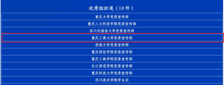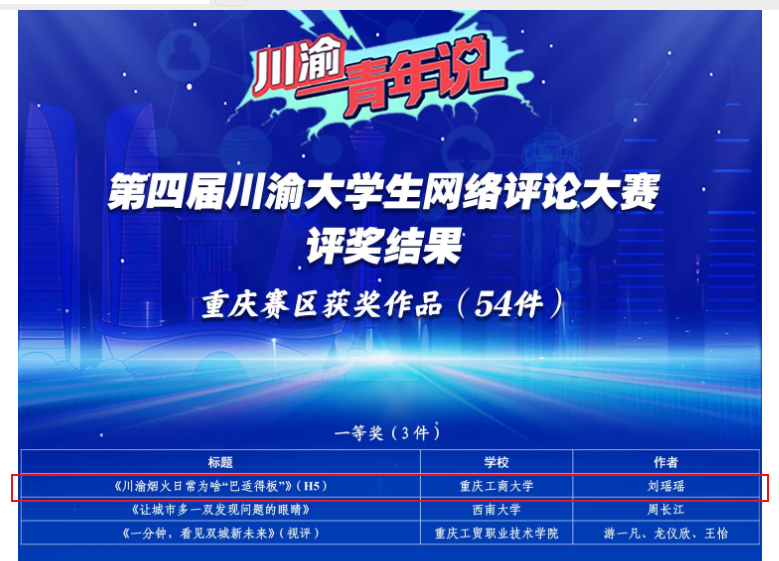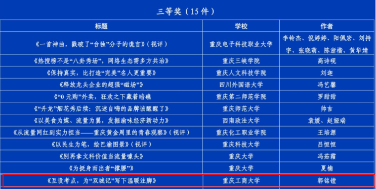 bat365官网共有2项作品获奖,文学与新闻学院刘瑶瑶同学的作品《川渝烟火日常为啥“巴适得板”》获一等奖,文学与新闻学院郭铭镗同学的作品《互设考点,为“双城记”写下温暖注脚》获三等奖。学校党委宣传部获优秀组织奖。