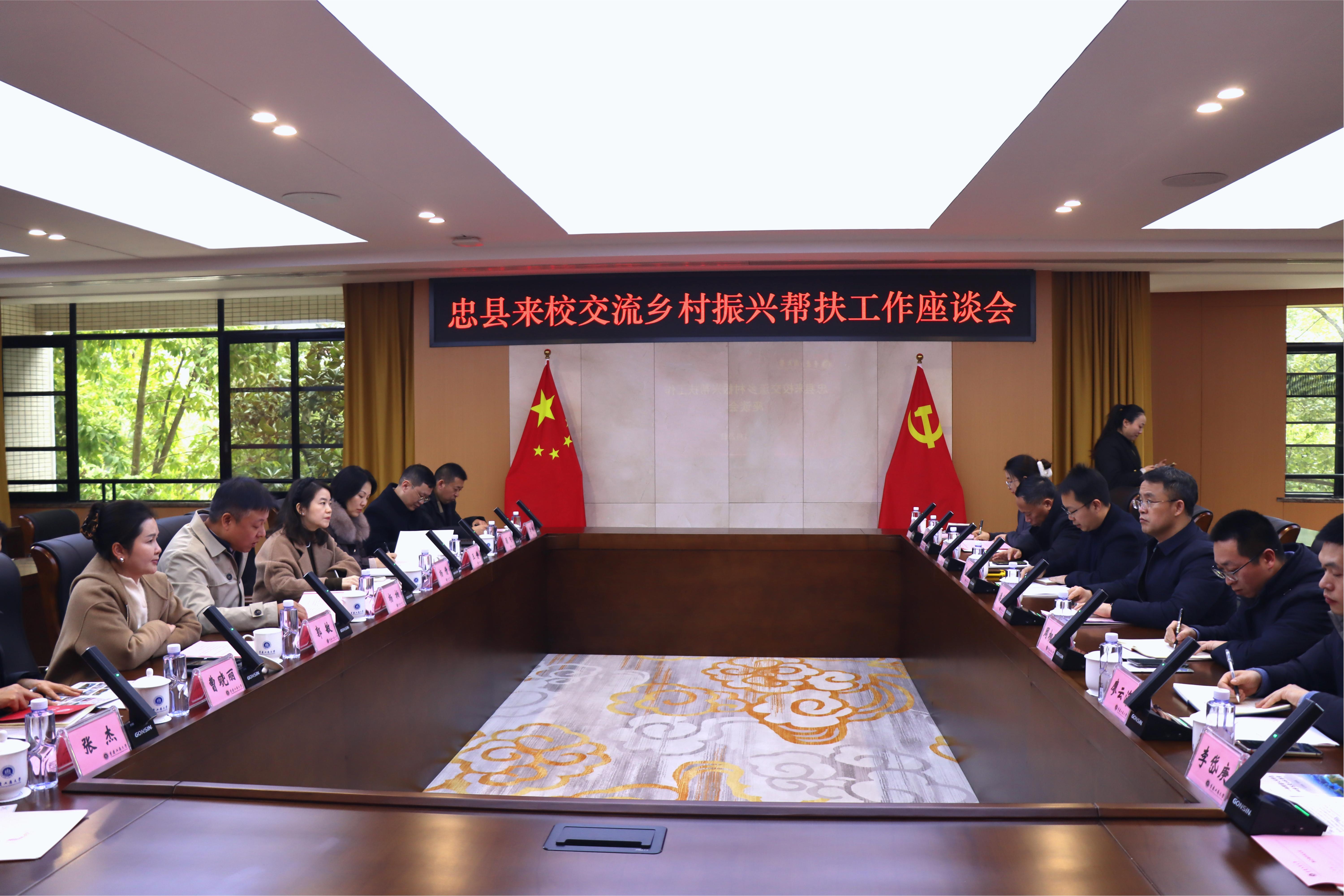 杨柏代表学校党委和行政向潘仕军一行的到来表示热烈欢迎,并向对方介绍了bat365官网“十四五”期间对忠县的乡村振兴帮扶工作开展情况。杨柏表示,学校坚决响应党中央和市委、市政府的号召,高度重视乡村振兴帮扶工作。下一步,学校将以此次交流座谈为契机,健全协同帮扶长效机制,制定年度帮扶计划,深化校地资源整合,精准对接忠县发展需求,充分发挥学校人才智力优势,一如既往地以智力帮扶为牵引,以产业帮扶、消费帮扶、文化帮扶、组织帮扶为协力,持续优化帮扶举措,形成助力忠县乡村全面振兴帮扶与学校相关学科专业建设良性互动、共促发展的工作格局,推进乡村振兴帮扶工作走深走实,助力忠县经济社会高质量发展。