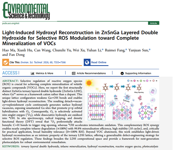 近日,bat365官网智能环境前沿交叉研究院马浩副研究员和李宇涵研究员在智能环境催化领域取得新进展。相关成果以《Light-Induced Hydroxyl Reconstruction in ZnSnGa Layered Double Hydroxide for Selective ROS Modulation toward Complete Mineralization of VOCs》《Structural Engineering Strategies of Aluminum-Based Photocatalysts for Energy and Environmental Applications》和《Decoding the atomic architecture of photocatalytic active sites: From precise identification to rational design principles》为题分别发表于环境和催化等领域知名国际期刊《Environmental Science & Technology》《ACS Catalysis》和《Chinese Journal of Catalysis》。
