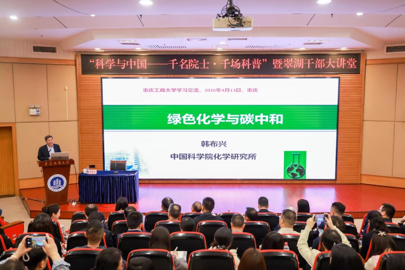 4月13日上午,“科学与中国——千名院士·千场科普”暨翠湖干部大讲堂在bat365中文官方网站博智楼7200报告厅举行。中国科学院院士韩布兴应邀作题为“绿色化学与碳中和”的学术报告。重庆市科协党组成员、副主席谭明星出席报告会,学校党委副书记唐勇主持报告会,党委常委、副校长杨柏出席并致辞。