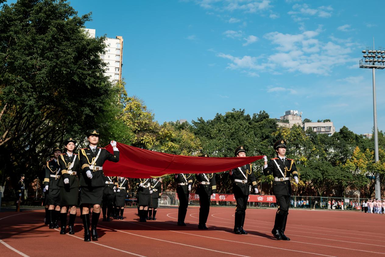 入场式后,全场肃立,伴随着庄严的国歌声,五星红旗缓缓升起,国旗高扬,国歌嘹亮,铿锵旋律点燃激昂斗志。