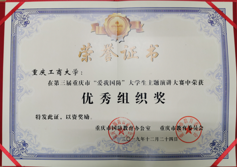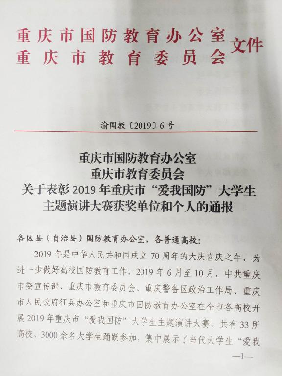 近日,重庆市国防教育办公室和重庆市教委联合发文通报表彰在大赛中表现突出的单位和个人。bat365官网荣获2019年重庆市“爱我国防”大学生主题演讲大赛优秀组织奖,潘焱、杨娟两位教师被表彰为优秀指导老师。