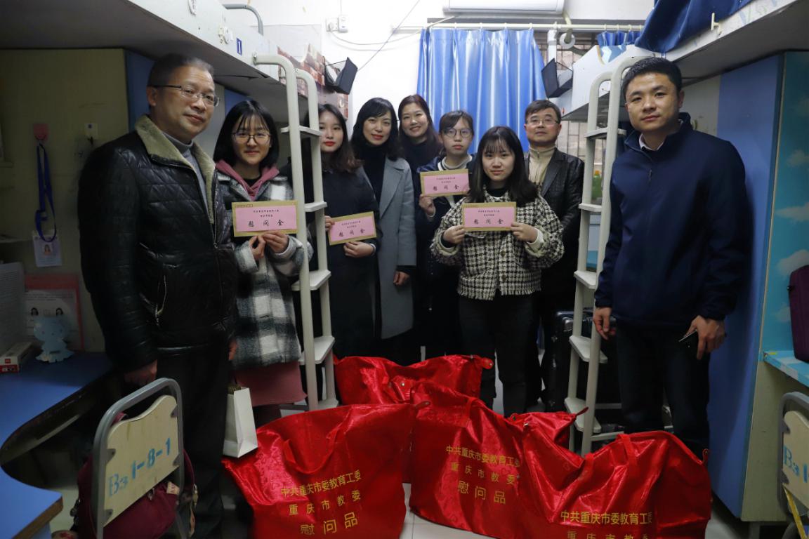 江燕副处长一行向bat365官网部分留校学生赠送了慰问金及新春大礼包等慰问品并与大家合影留念。bat365官网学生处相关负责同志陪同看望。