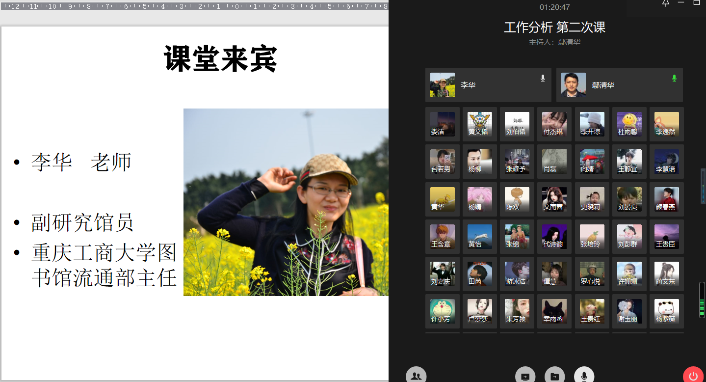 在第一周网络教学中,人力资源管理系教师积极探索引入企业人士进入网络课堂与师生互动交流,先后邀请了金科地产、海尔物流的企业高管探讨相关主题,取得良好的课堂反馈,受到了学校和学院的肯定。为进一步纵深推进在线教学工作,人力资源管理系主任郑月龙博士与人力资源管理专业冉景亮博士、鄢清华老师等进行了积极探讨,并于3月9日,以《工作分析》课程先行试水,鄢清华老师进一步探索将这种模式扩展为一种全景式网络课堂。所谓工商管理学科课程全景课堂,以往的教学模式是将具体的案例的视频、场景、角色等的呈现方式的全景化,使学生感受更真实全面。而网络教学模式下,由于课堂与外部资源的连接更为便利,可以实现课堂教学与外部的企业、专家、相关的工作人员直接对接,是另外一种意义上的全景式课堂。